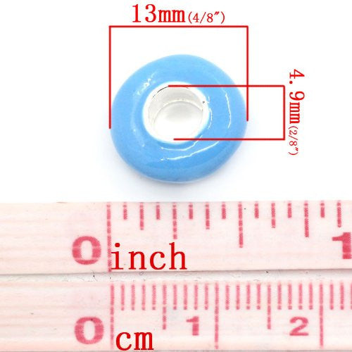 European Charm Beads Flat Round Silver Plated Enamel Blue