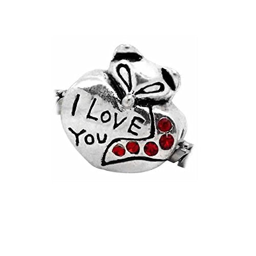 - " I Love You " W/Ruby Red July Birthstone Crystals Charm Bead Silver Plated Charm Bead Pandora Troll Chamilia Kay Zable Compatible