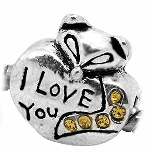 - " I Love You " W/Yellow Birthstone Crystals Charm Bead Silver Plated Charm Bead Pandora Troll Chamilia Kay Zable Compatible