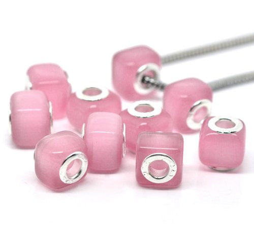 • Silver Imitation Core "Pink Cats Eye" Glass Cube Bead Fits Pandora, Troll, Chamilia, Carlo Biagi, Zable, and Other Add-a-bead Bracelets.