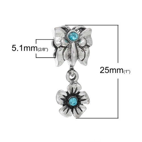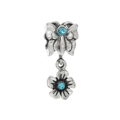 Butterfly with Flowercharm Bead w/ Light Blue Crystals Compatible W/most European Snake Chain Bracelet